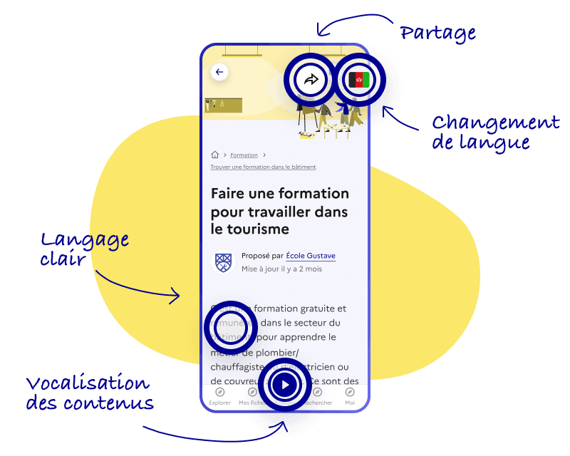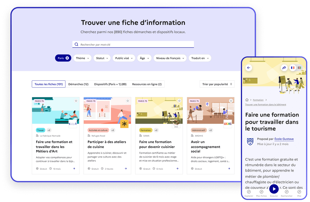 Une fois rédigée, la fiche de votre action sera relue et simplifiée, traduite gratuitement en 7 langues, vocalisée et facilement partageable. Elle sera visible dans une application adaptée aux usages numériques des personnes réfugiées.